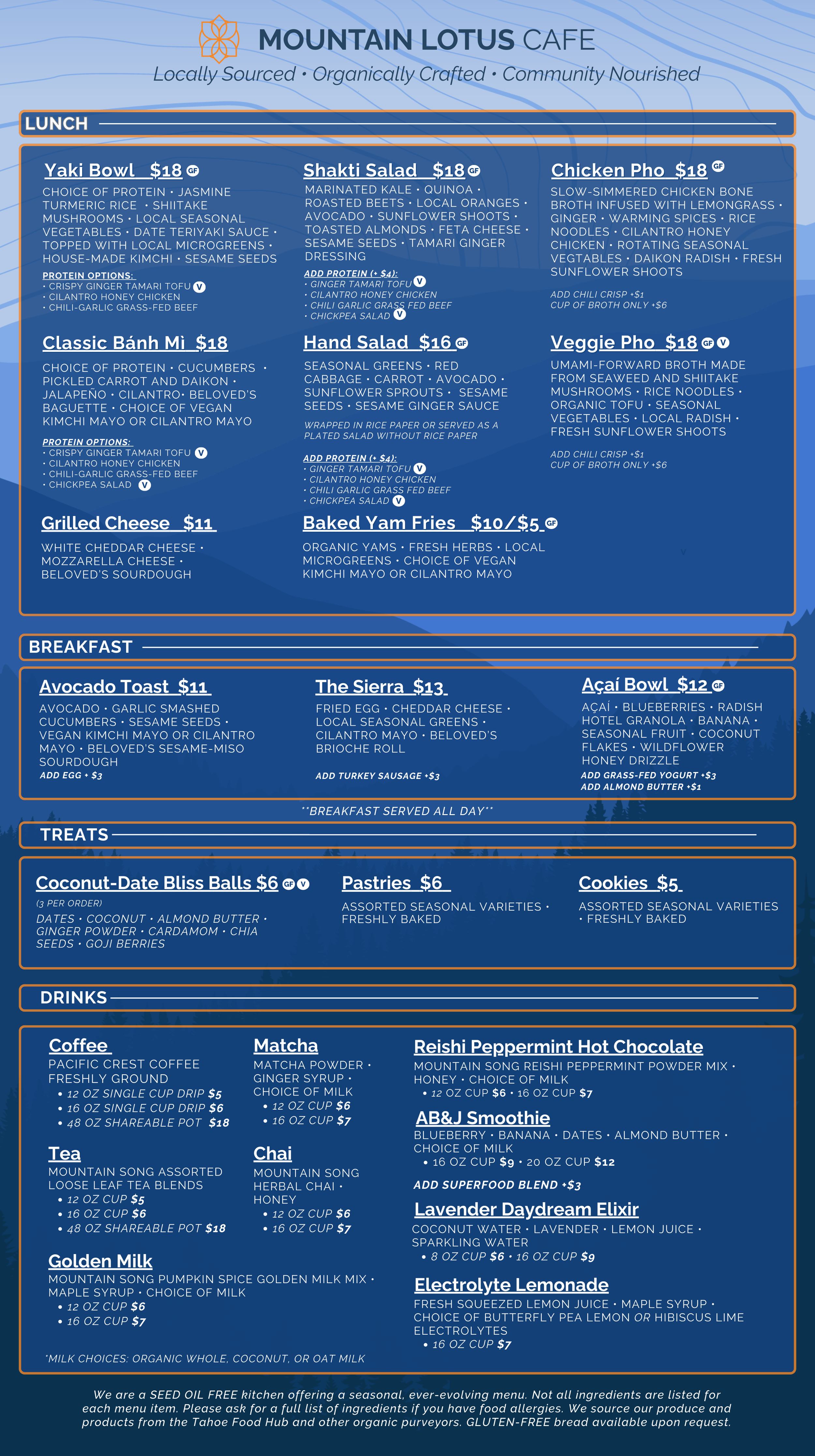 At Mountain Lotus Cafe, food is an expression of connection, care, and place. Led by Chef Rich Selden, we create nourishing, seasonal dishes in partnership with local small farms across the Tahoe-Sierra region. Each meal reflects our commitment to slow food values—celebrating where our ingredients come from, honoring the hands that grow them, and inviting our community to gather around wholesome, thoughtfully prepared dishes. Designed to nourish you for peak performance—whether at work, in the yoga room, or adventuring through the mountains—our food invites you to gather, refuel, and reconnect with what truly sustains.